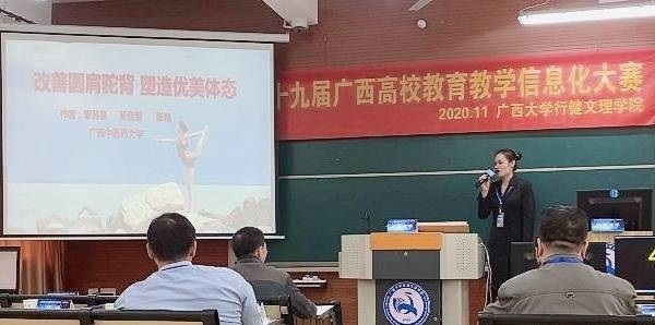 本次大赛共收到全区 72 所高校推荐 632 件参赛作品,大赛组委会组织专家于 2020 年 10 月 12 日—20 日对作品进行了网络初评,按文件规定评出 316 件入围 作品进入决赛(入围 50%),教研室覃月泉老师的作品《改善圆肩驼背、塑造优美体态》顺利进入了决赛。