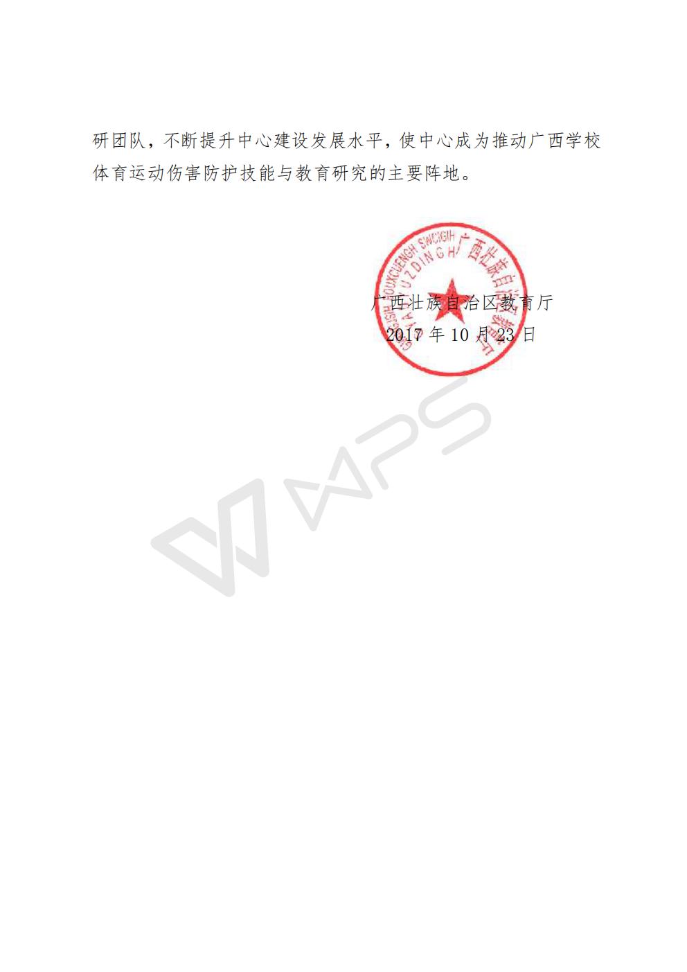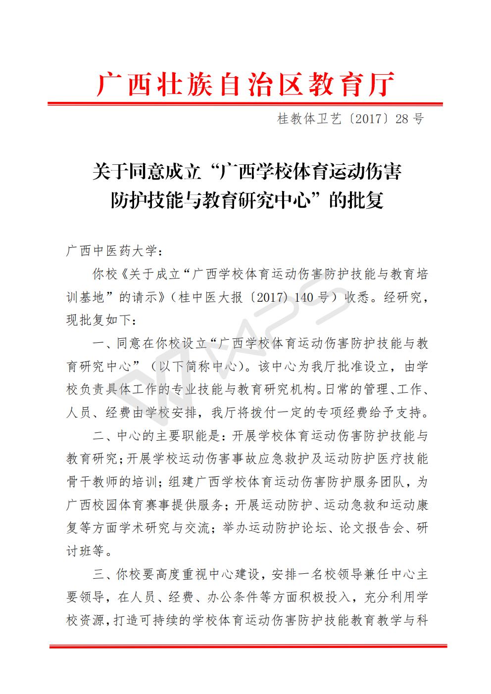 桂教体卫艺〔2017〕28号关于同意成立“广西学校体育运动伤害防护技能与教育研究中心”的批复