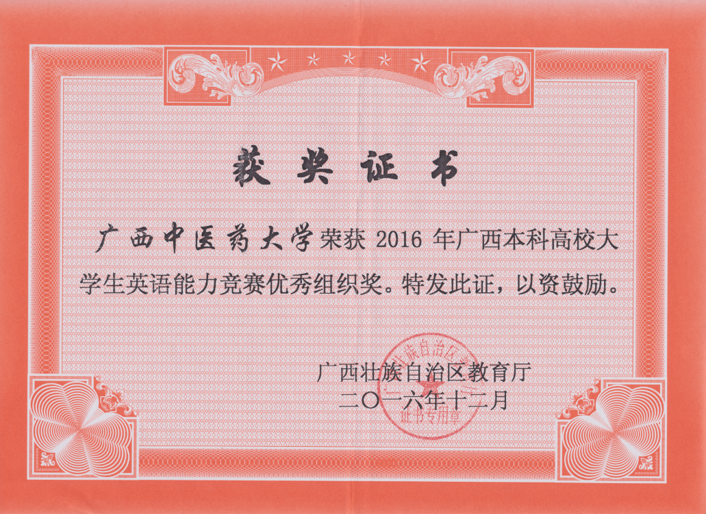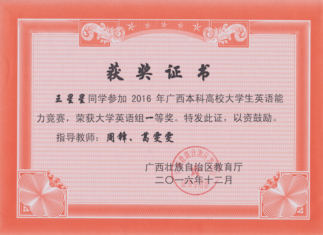 beat365王星星、王羽珩同学在2016广西本科高校大学生英语能力竞赛上分别取得一等奖和三等奖,学校被授予竞赛优秀组织奖。