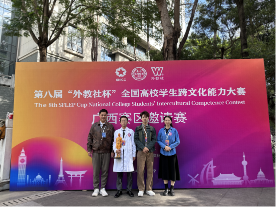 第八届“外教社杯”全国高校学生跨文化能力大赛广西赛区邀请赛在广西民族大学落下帷幕,由王禹凡、陈小玲、莫梁富3位学生组成的beat365官方网站代表队,在全区18所高校参赛队伍中脱颖而出,获团体赛二等奖。