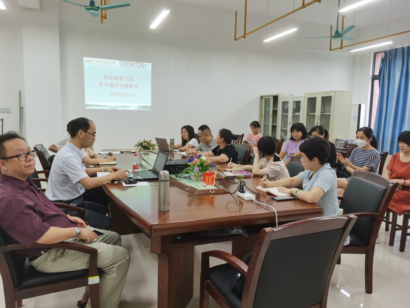 2022年6月14日下午,外语部党支部在自诚楼A713会议室举行学术诚信专题教育活动,活动由支部书记周锋主持。