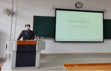 春雨绵绵的4月末,在结束7周线上教学工作后,为做好学生返校教学的各项准备工作, 2020年4月24日早上,外语部全体教师在仙葫校区教学楼1-404举行2019-2020学年第二学期新学期大会。