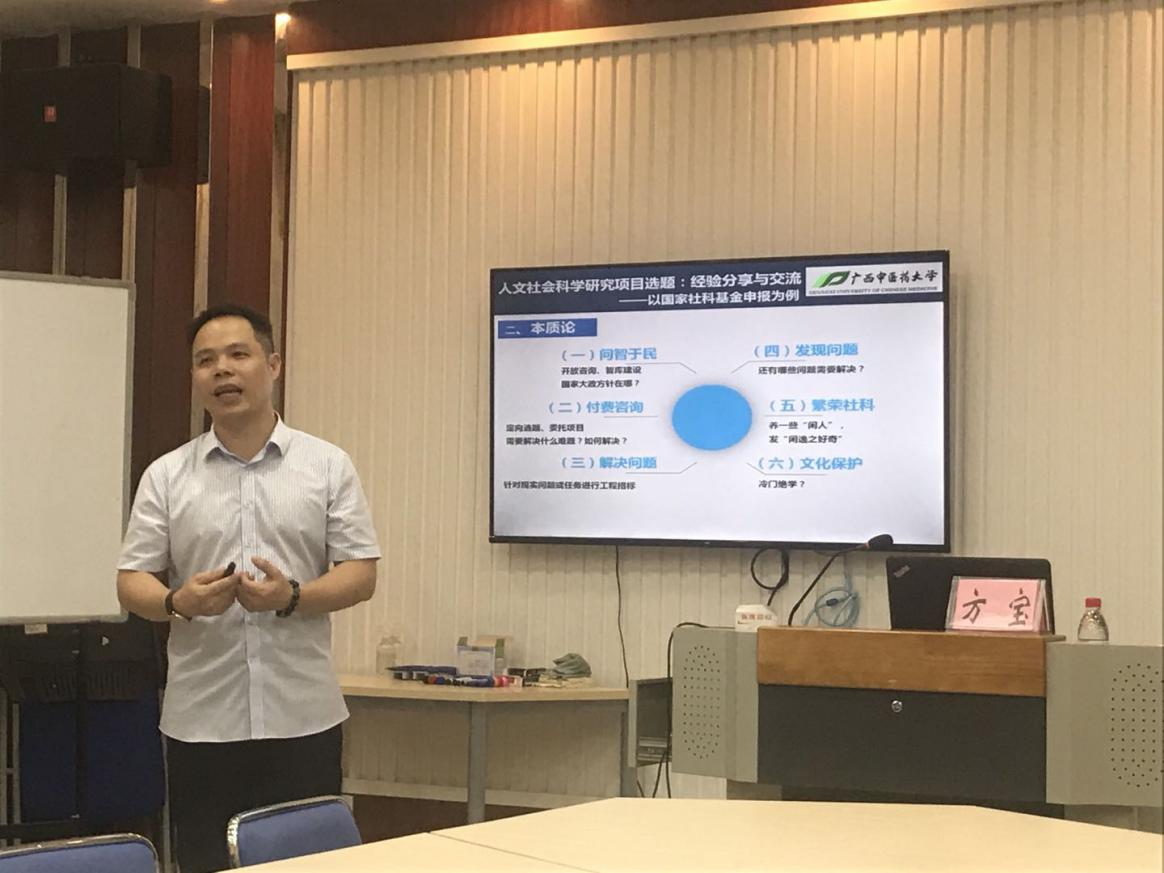 2020年6月17日,外语部方宝博士在学校沙龙教室作学术讲座,本次讲座由科技处和外语部共同主办。此次讲座主题为“人文社会科学研究项目选题:经验交流与分享——以国家社科基金申报为例”,外语部全体教师和来自马克思学院、体育部、壮瑶医学院及基础医学院等学院的老师参加了讲座。