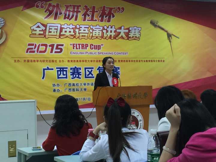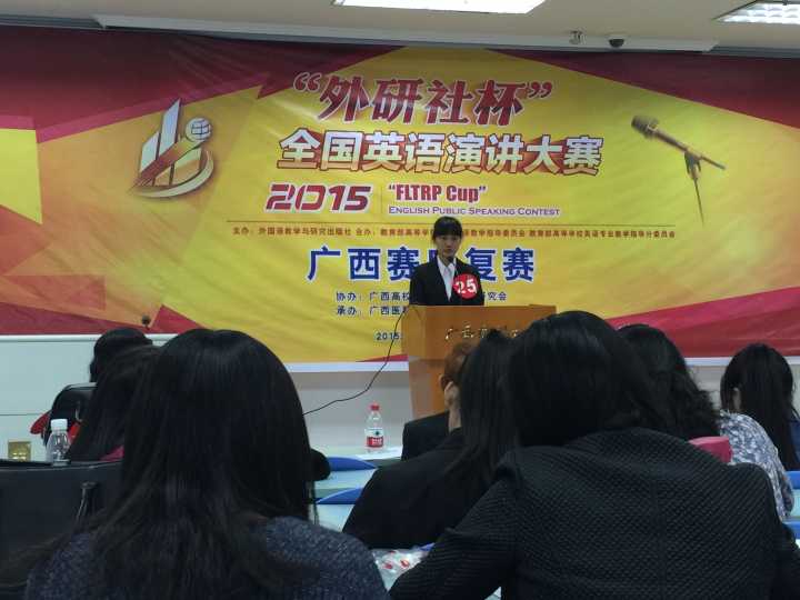 2015年 11月 1 日,由外语教学与研究出版社主办,教育部高等学校大学外语教学指导委员会与教育部高等学校英语专业教学指导委员会合办,广西医科大学承办的2015年"外研社"杯全国英语演讲比赛广西赛区决赛在广西医科大学隆重举行。