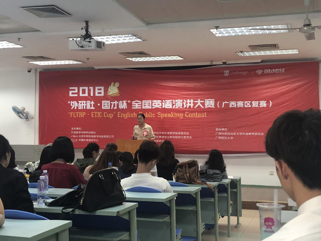 10月28日,2018年“外研社.国才杯”全国英语演讲大赛(广西赛区复赛)在广西医科大学举行,beat365派出陈雯悦和甘佳丽两位同学参赛,其中2017级口腔医学专业的陈雯悦同学在这次比赛中取得了三等奖。