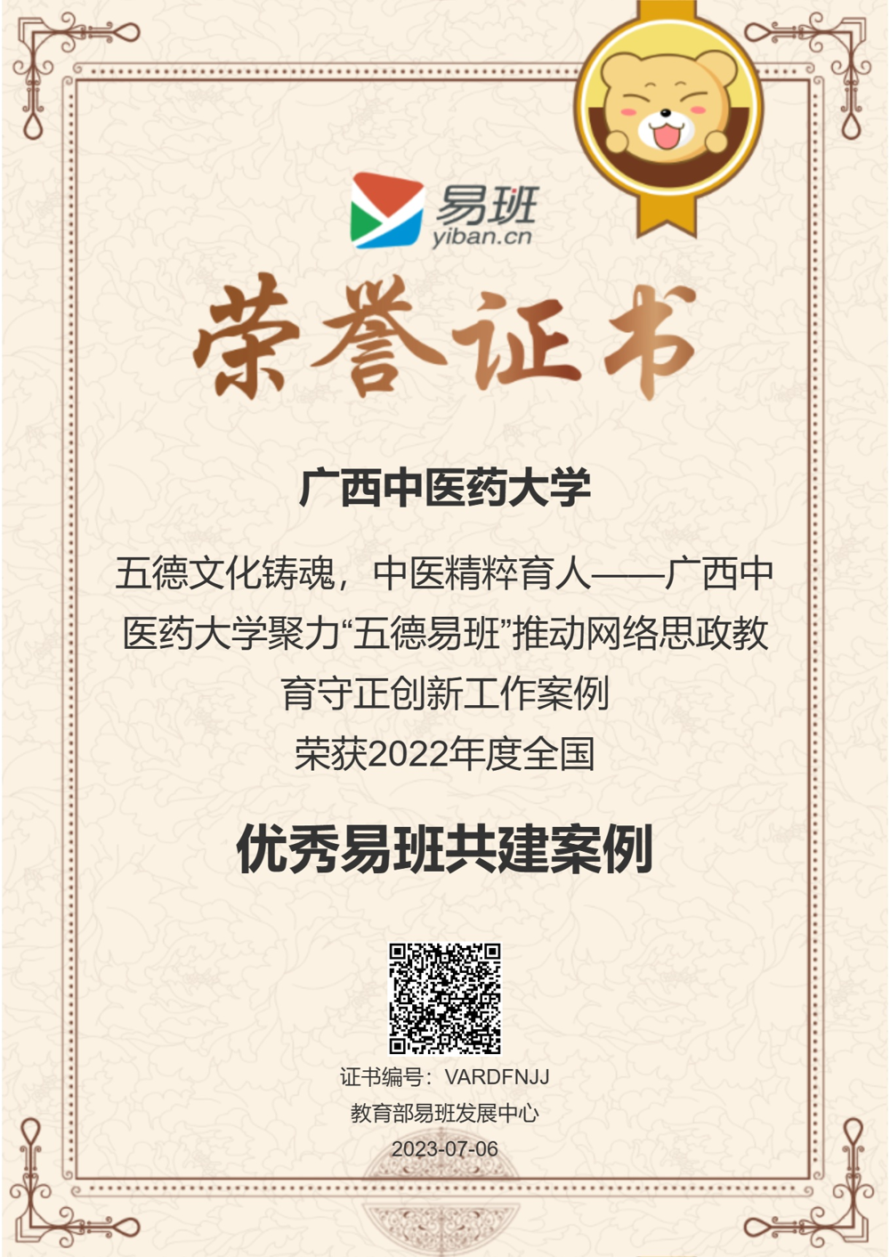 为了表彰2022年度在易班建设方面表现突出的高校、案例、指导教师、辅导员和工作站站长,各省举办了省级易班“十佳”(优秀工作案例)评选活动。教育部易班发展中心共收到了全国25个省区市及新疆生产建设兵团推荐的近900个优秀工作案例。经过专家对各省推荐材料的筛选以及综合考量2022年全年高校易班双指数及活动参与情况,最终选定了235所高校的422项工作案例,分别列入五大类全国易班共建优秀名单。beat365被评为“优秀易班共建高校”,同时“五德文化铸魂,中医精粹育人——beat365官方网站聚力‘五德易班’推动网络思政教育守正创新工作案例”荣获“2022年度优秀易班共建案例”。