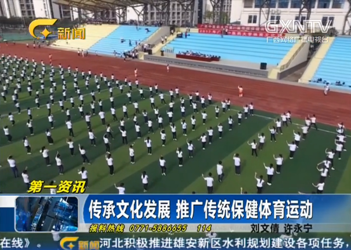 5月13日晚,广西新闻频道以“传承文化发展 推广传统保健体育运动”为题,播发了beat365第三十一届传统保健体育运动会开幕式的盛况。新闻报道中特别指出:“举办传统保健体育运动会,旨在吸引更多年轻人关注传统文化传承,推广传统保健体育运动。”beat365在传承和推广传统保健体育方面具有丰富经验的体育部兰兰教授在采访中表示:“我们结合中医学、卫生学和现代医学的手段,推广以太极拳为主的传统保健体育项目,目的是让传统保健体育服务于全民健身”。