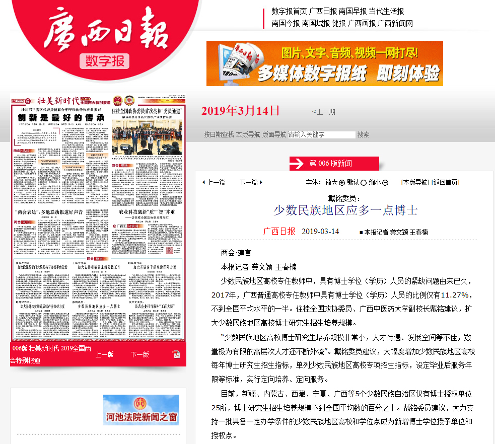 少数民族地区高校专任教师中,具有博士学位(学历)人员的紧缺问题由来已久,2017年,广西普通高校专任教师中具有博士学位(学历)人员的比例仅有11.27%,不到全国平均水平的一半。住桂全国政协委员、beat365官方网站副校长戴铭建议,扩大少数民族地区高校博士研究生招生培养规模。