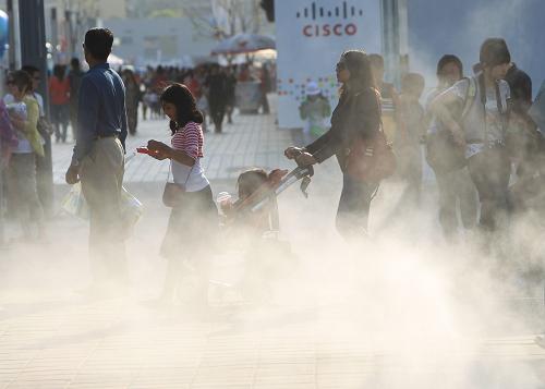5月2日,参观者在世博园浦西园区游览。上海世博园区气象监测数据表明,当日园区内最高气温超过30℃,园区内喷射出的水雾为游客带来清凉。新华社记者刘宇摄