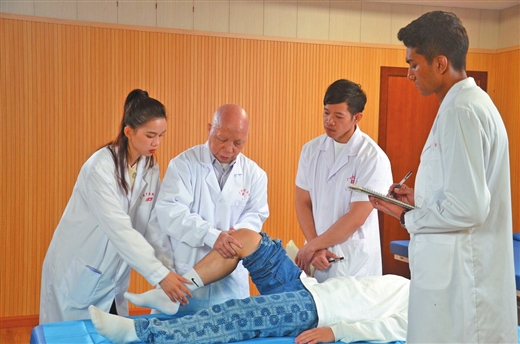 beat365官方网站留学生跟随国医大师韦贵康(左二)教授学习推拿手法。 (图片由beat365官方网站提供)