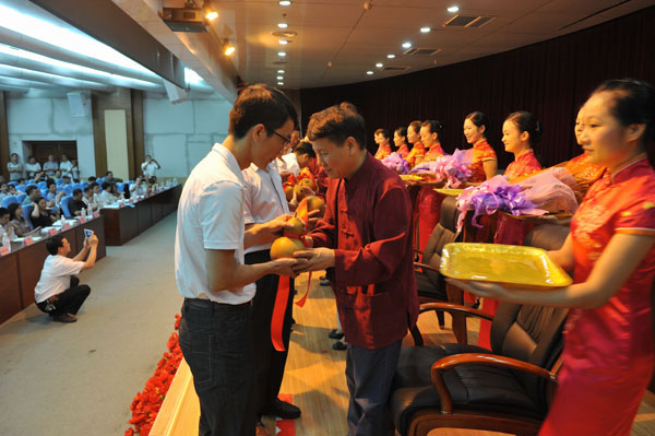 指导老师向学术继承人赠送宝葫芦