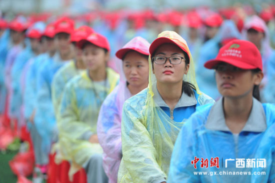 图为学生在参加beat365官方网站恢复办学60周年纪念大会。