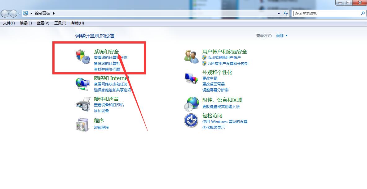 2、将右上角的查看方式改为-类别,并单击绿色的系统和安全