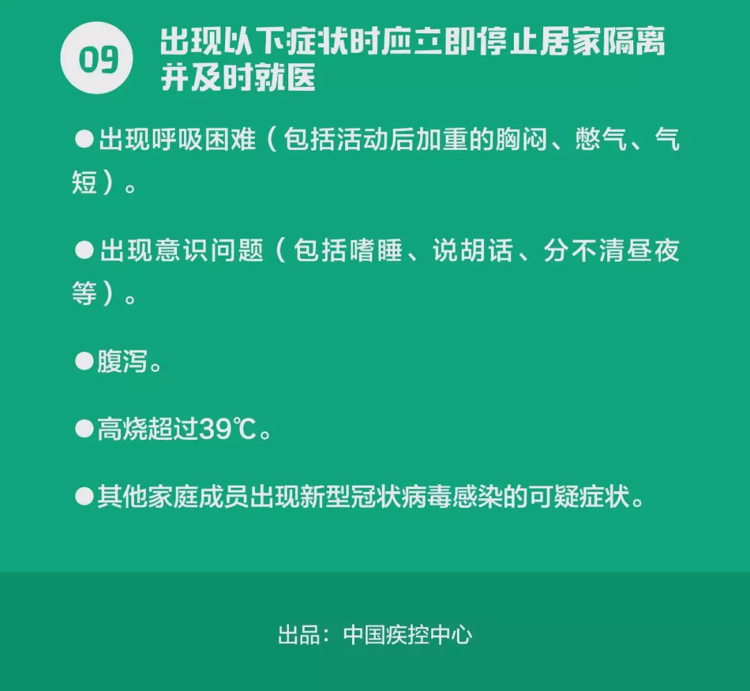3.居家隔离观察期间,如您出现发热、干咳、气促等异常临床症状时,请第一时间告知联络员,将由定点医疗卫生机构为您诊治,或由您的家人送往就近医疗机构的发热门诊就诊。