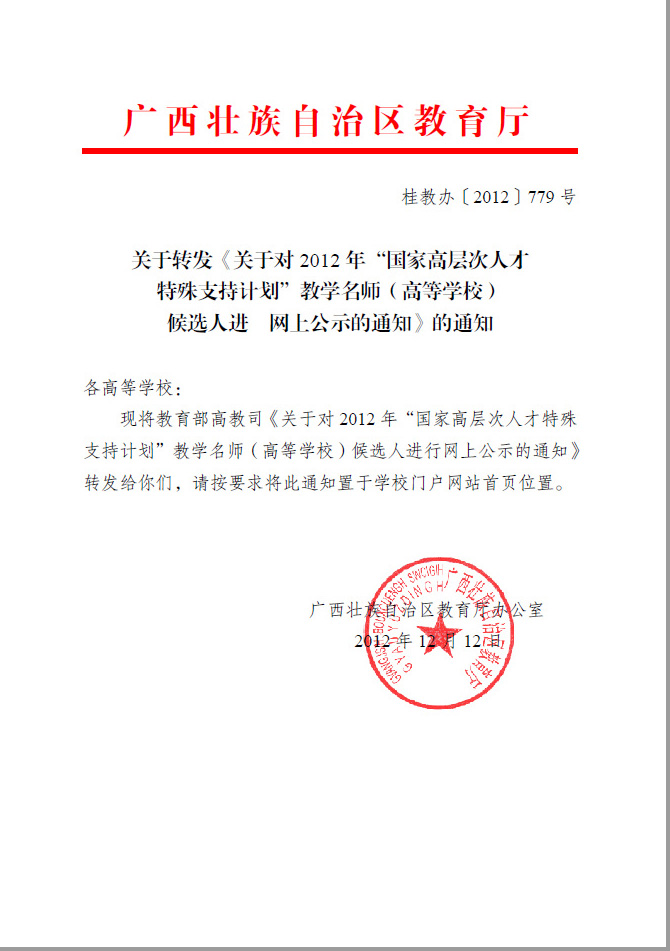 关于转发《关于对2012年“国家高层次人才特殊支持计划”教学名师(高等学校)候选人的进行网上公示的通知》的通知 来源:宣传部 作者:宣传部 日期:2012-12-14 点击数: 次 分享到: 打印正文 关闭本页