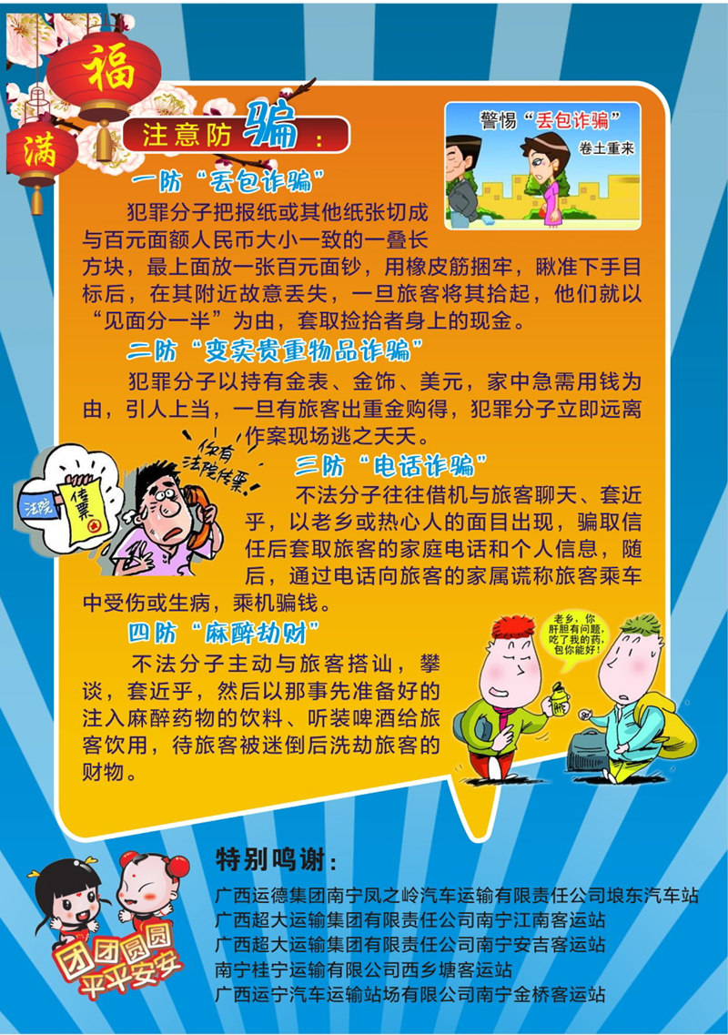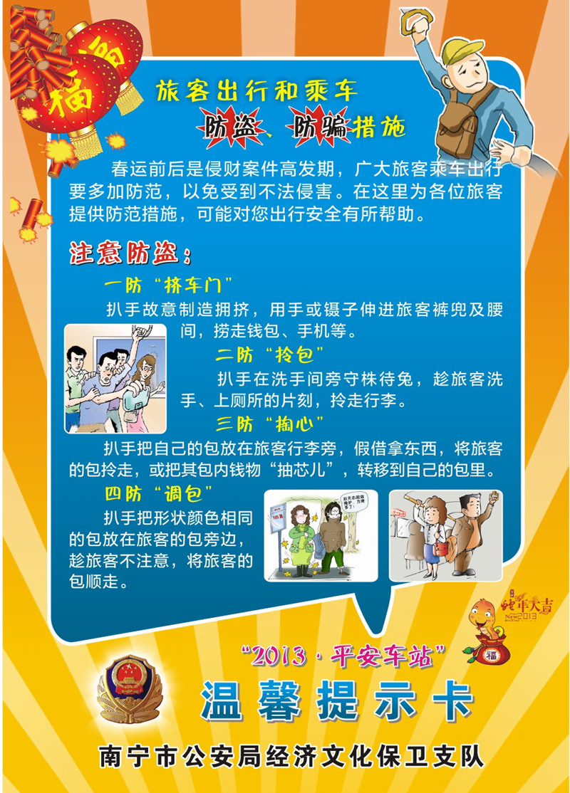 [图片]平安春运 平安校园——校园安全相关知识 来源:武装保卫部 作者:武保部 日期:2013-01-24 点击数: 次 分享到: 相关链接: 南宁市公安局高校安全守望室:http://blog.gxnews.com.cn/blog-124452.html 打印正文 关闭本页