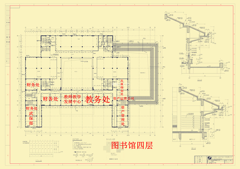 四层:图书馆书库、财务处、武保部、教师教学发展中心、教务处、发展规划处(学科办合署)、资产运营公司、资产管理处。