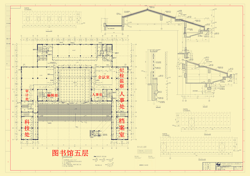五层:图书馆书库、人事处、科技处、纪检监察室、审计处、编辑部、会议室、档案室(永久性)。