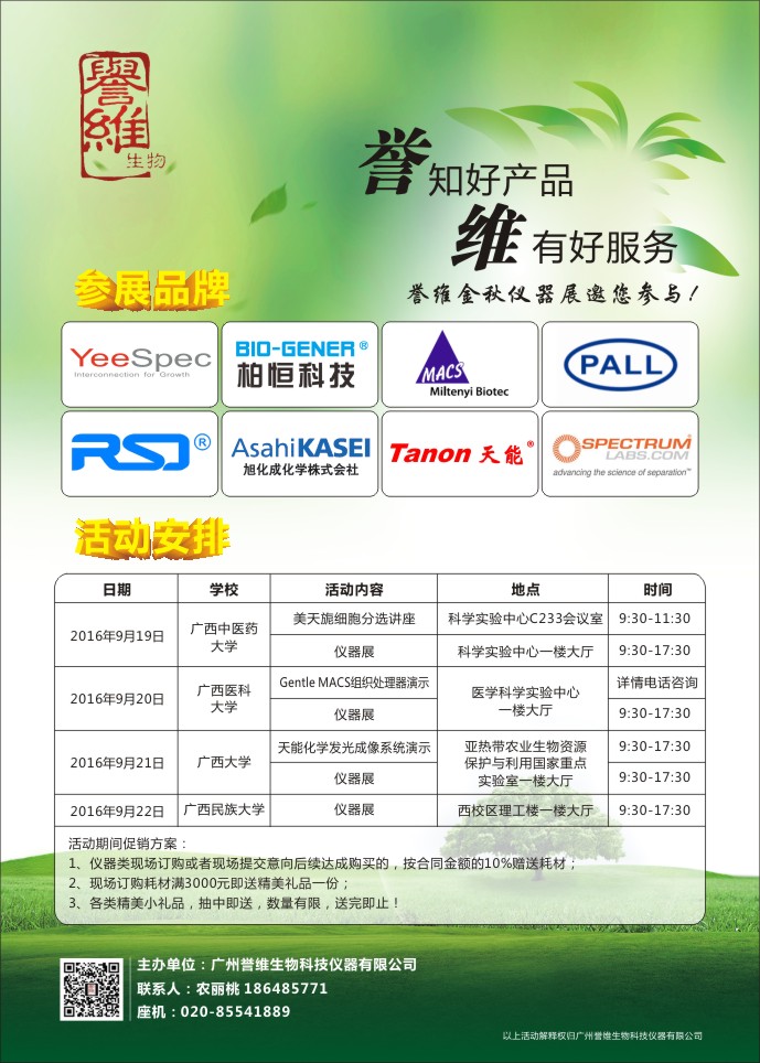 关于广西中医药科学实验中心“美天旎组织处理器”相关培训的通知 日期:2016-09-09 点击数: 次 分享到: 时间:2016年9月19日星期一 上午9:30 地点:beat365官方网站(仙葫校区)科学实验中心会议室C233 内容:1.gentelMACS组织处理器的现场操作演示及仪器操作规程讲解 2.相关讲座 3.美天旎仪器展示 请各位感兴趣的老师、同学踊跃参加! 打印正文 关闭本页