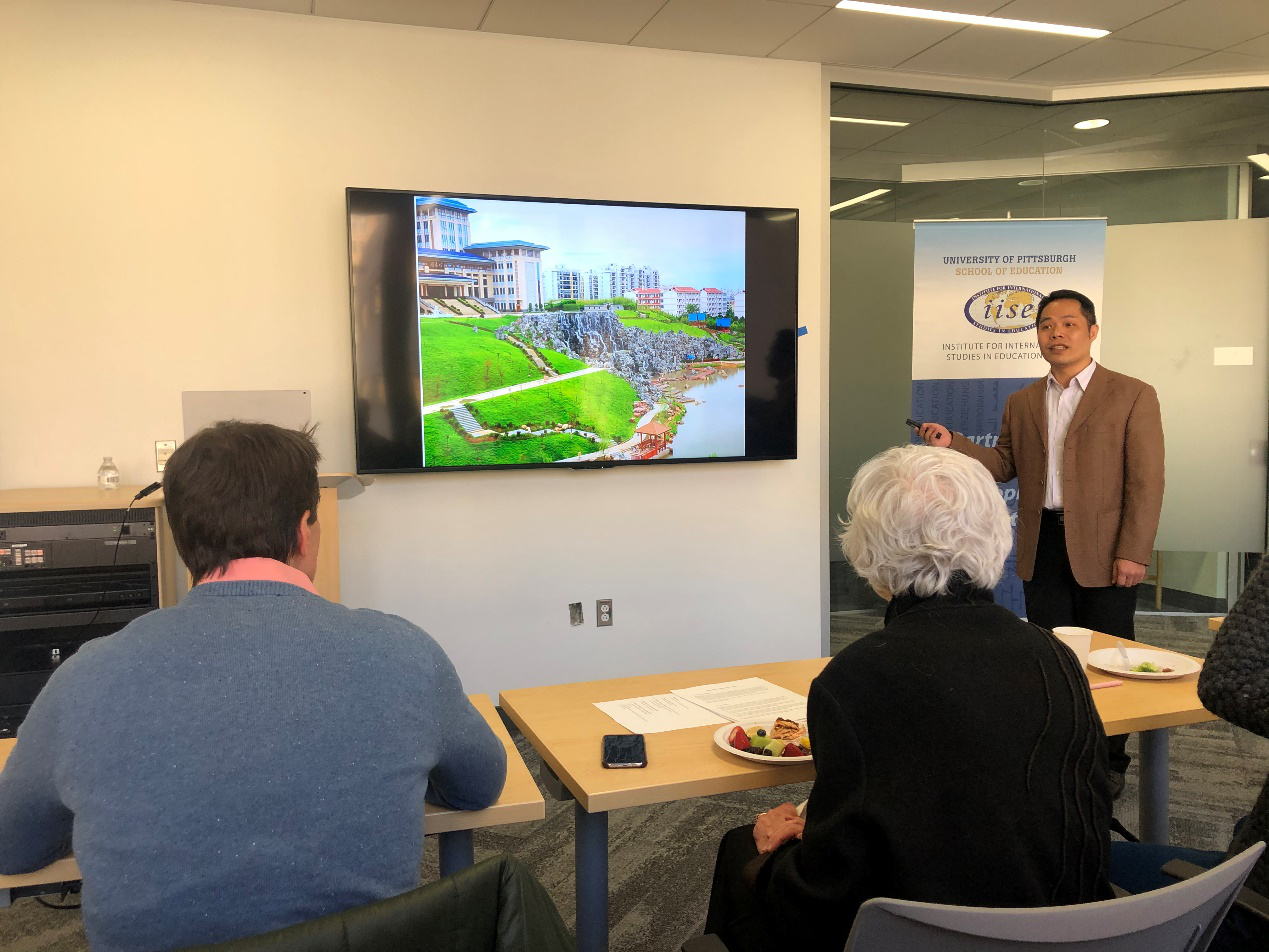 近日,正在美国匹兹堡大学访学的外语部方宝老师,给匹兹堡大学教育学院的师生们做了一场题为“Trends in International Higher Education Students Studying Abroad in China——Data Analysis, Problems, and Suggestions”(来华留学生教育的变化趋势研究——数据分析、现存问题与发展建议)的英文学术讲座。在讲座的前部分,方宝老师介绍了beat365官方网站的概括,并通过丰富的图片,展示了beat365风景秀丽的校园环境、独具特色的国际壮医医院等。现场师生对beat365新校区建设所体现出的秀美景观以及人文情怀表示由衷赞叹。