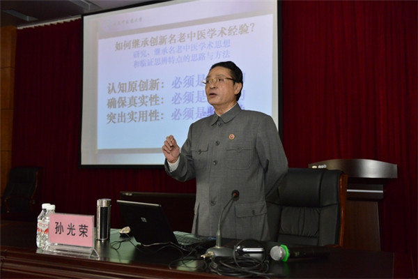 孙教授在中医及中国文化上有很深的造诣,从事中医临床诊疗56年,创立了“中和思想•中和辨证•中和组方”的中和医派,擅长治疗中医内科、妇科疑难杂症,特别是脑病、肿瘤、脾胃病以及妇科带下病等。此次孙教授莅临一附院,不仅跟一附院领导进行了深入交流,对潜心研究经典中医的学术带头人等在经典中医课题研究、师承工作室的建设进行了具体指导,并围绕“中和医派”学术思想结合临床病案以及如何认知与继承名老中医的学术思想做了精彩的演讲。他认为,中医药界目前最关键的是人才问题,而中医人才的培养重点在于继承与创新,优秀中医临床人才成才之路不外乎读经典、做临床、拜名师的模式,而继承老中医学术思想的四大重点一是加强医德修养,端正医疗作风;二是训练四诊合参,突出思辨特点;三是继承独特的组方用药思路方法;四是提高中医药文化素养。名老中医的学术思想具有原创性、真实性、实用性的特点,这是总结名老中医学术思想的思路,并列举了蒲辅周、路志正、李济仁三位中医药学家的学术思想,告诉我们如何去认知和发现名老中医的学术思想,继承者必须从侍诊和研读典型医案入手,领悟原创、追索本源、求证验案,才能发现名老中医的学术思想。而在谈到如何继承与创新名老中医临证思辨特点方面,他认为名老中医临证思辨特点在名老中医学术经验的总结中具有核心地位,在名老中医学术经验传承中具有启迪作用,要正确抓住其在长期临证实践中形成的独具特色的诊疗思辨的着力点并加以提炼和阐述,才能很好掌握。