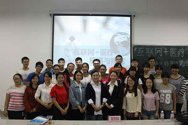 夏老师用图文并茂的PPT,通过简洁明了的图表和深入浅出的语言,详尽介绍了“互联网+医疗”的时代背景、目标、优势、国内外情况以及对医学行业的影响等,同时向同学们展示了“在线医疗咨询”、“移动医疗”等新型医疗方式。同学们专注听讲、受益良多。
