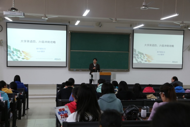 为了帮助同学们熟悉《新东方多媒体学习库》的使用方法,获得更广阔的信息源,全面了解英语四、六级资讯,熟练掌握英语四、六级考试技巧,提高英语四、六级考试通过率,11月29日,图书馆特邀请南宁新东方学校黄宇校长到beat365仙葫校区1-101、明秀校区西梯二教室分别进行了讲座。蒋才武馆长主持此次讲座,400余名学生听取了讲座。