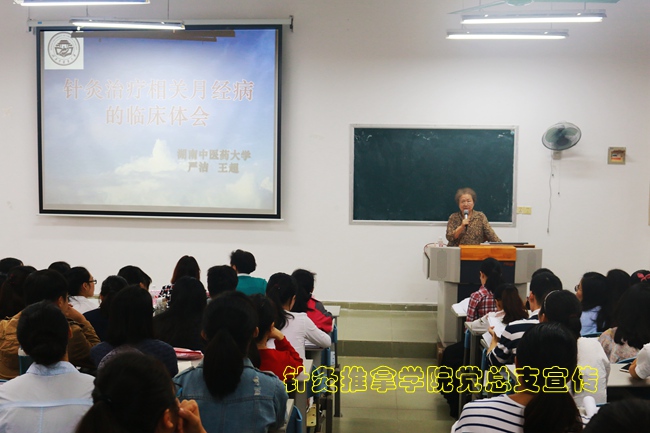 11月18日,在庆祝学校“恢复办学六十周年”之际,针灸推拿学院在明秀校区西B1教室举办了主题为“督、冲、任三脉和月经不调关系的理论与临床探讨”的研究生学术论坛活动,并特邀湖南中医药大学博士生导师严洁教授、常小荣教授、硕士导师王超副教授为论坛作专题讲座。论坛分别由范郁山院长、蒋闽义书记、陈靖红副院长主持。