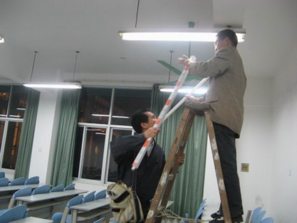 水电中心加班检修所有教室的照明 来源:后勤管理处 作者:覃流湘 日期:2009-12-17 点击数: 次 分享到: 时值临近考试,为给同学们有个明亮舒适的学习和应试环境,学校水电中心对所有教室照明进行全面的检修。为不影响正常的上课和自习,水电中心利用晚上时间加班对各个教室逐一检修,连续加班了四个晚上,把学院应维修的教室照明检修完毕。 维修教室照明 维修实验室照明 明亮的教室 维修路灯 完工收队 (后勤管理处 覃流湘) 打印正文 关闭本页