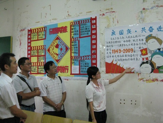 10月12号下午,第一临床医学院团总支、学生会举办“与祖国共喜庆,与健康共前行”为主题的海报评比活动,评委由第一临床医学院教学党总支专职副书记覃国智老师,教学部、学工部副主任林强老师,广西中医学院第一附属医院团委副书记肖易老师,团委李杭老师,年级主任秦燕老师以及团总支、学生会部分委员和各班级宣传委员共同组成。老师们在学生会及各班代表的陪同下,对各班级的海报逐一进行了评分、计分和点评。各班级团结一致设计迎评海报,发挥了最好水平。教室内洋溢着同学们的青春,海报上写满了同学们对祖国的热爱和抗击甲流的决心。最终06针推班摘得桂冠,06传统班荣获最佳创意奖。