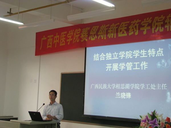 3月2日,赛恩斯新医药学院2010年春季辅导员学习班在仙葫校区赛教102举行。广西中医学院学工处处长冼锦华,广西中医学院团委书记李月发,赛恩斯新医药院常务副院长谢丽莎、党总支书记徐方明,广西民族大学相思湖学院学工部主任兰晓锋对赛院辅导员进行培训。