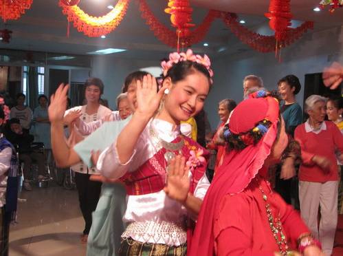 4月28日下午三点,广西重阳老年公寓二楼舞厅欢歌笑语,泰国孔敬大学护理学院、广西中医学院护理学院的学生与公寓老人齐联欢,庆“五一”。