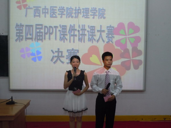 2011年6月2日19:30,广西中医学院护理学院第四届护士文化节系列活动之PPT课件制作大赛在广西中医学院明秀校区西梯一教室成功举办。护理学院吴彬院长出席了此次活动,担当此次大赛的评委老师有:护理学院学工办主任徐凤琼老师、分团委书记玉锋老师、梁凯讴老师及黄晓南老师等。