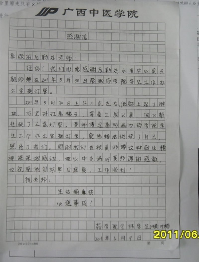 药学院全体学生致后勤处职工的感谢信 来源:药学院 作者:药学院全体学生 日期:2011-06-10 点击数: 次 分享到: 尊敬的后勤处老师:您好!我们非常感谢后勤处水电中心黄东毅师傅在2011年5月30日帮助药学院学生工作办公室换灯管。2011年5月30日上午11点左右,他脚上起了肿块,仍坚持扛着梯子,拿着工具认真、细心帮忙换了三盏灯管。黄师傅忍着伤痛为药学院学生工作办公室换灯管,就像蜡烛燃烧了自己,照亮了我们。同时我们也被黄师傅这种敬业精神深深感动,心中充满对黄师傅的感谢,也祝愿他身体早日康复,工作顺利!祝老师: 生活愉快 心想事成药学院全体学生二〇一一年六月九日 打印正文 关闭本页