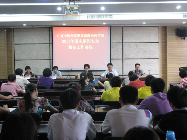 会上,徐方明书记传达了国庆期间维稳工作的相关文件精神,以及广西中医学院安全稳定工作会议精神,通报了9月28日上午赛恩斯新医药学院对学生公寓、图书馆、实验室等进行校园安全大检查的情况。他要求全院各部门高度重视安全稳定工作,及时排除发现的安全隐患,确保校园安全稳定。