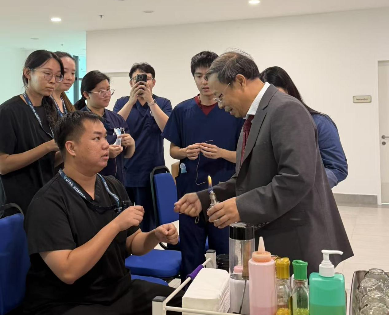 培训中,蓝毓营教授系统讲解了壮医药线点灸的理论基础与操作要领,并重点结合感冒、咳嗽、胃痛、带状疱疹等东南亚地区常见病,进行了临床应用的现场演示。学员通过分组实操积极掌握技术要点,并围绕马来西亚当地常见多发病症,就疗法的适应性与优化调整展开了深入交流,现场互动频繁、学习气氛热烈。