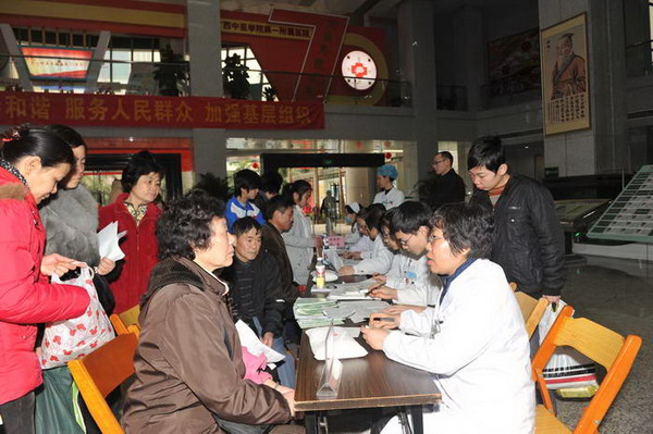 每年3月是全区教育系统学雷锋活动月,根据中央和自治区的部署要求,一附院党委号召全院党员干部职工开展以“学雷锋志愿服务”为主题的志愿服务活动。一附院肾病、风湿病科于2012年3月8日第七个“世界肾脏病日”举行了“关注肾脏健康”大型宣教义诊活动,为广大市民提供了免费健康咨询、体检、诊治及慢性肾衰中医饮食指导等服务。通过义诊、板报宣传等多种形式,让市民了解今年 “世界肾脏病日”的主题是 “捐献肾脏,延续生命”及肾脏健康的相关知识。