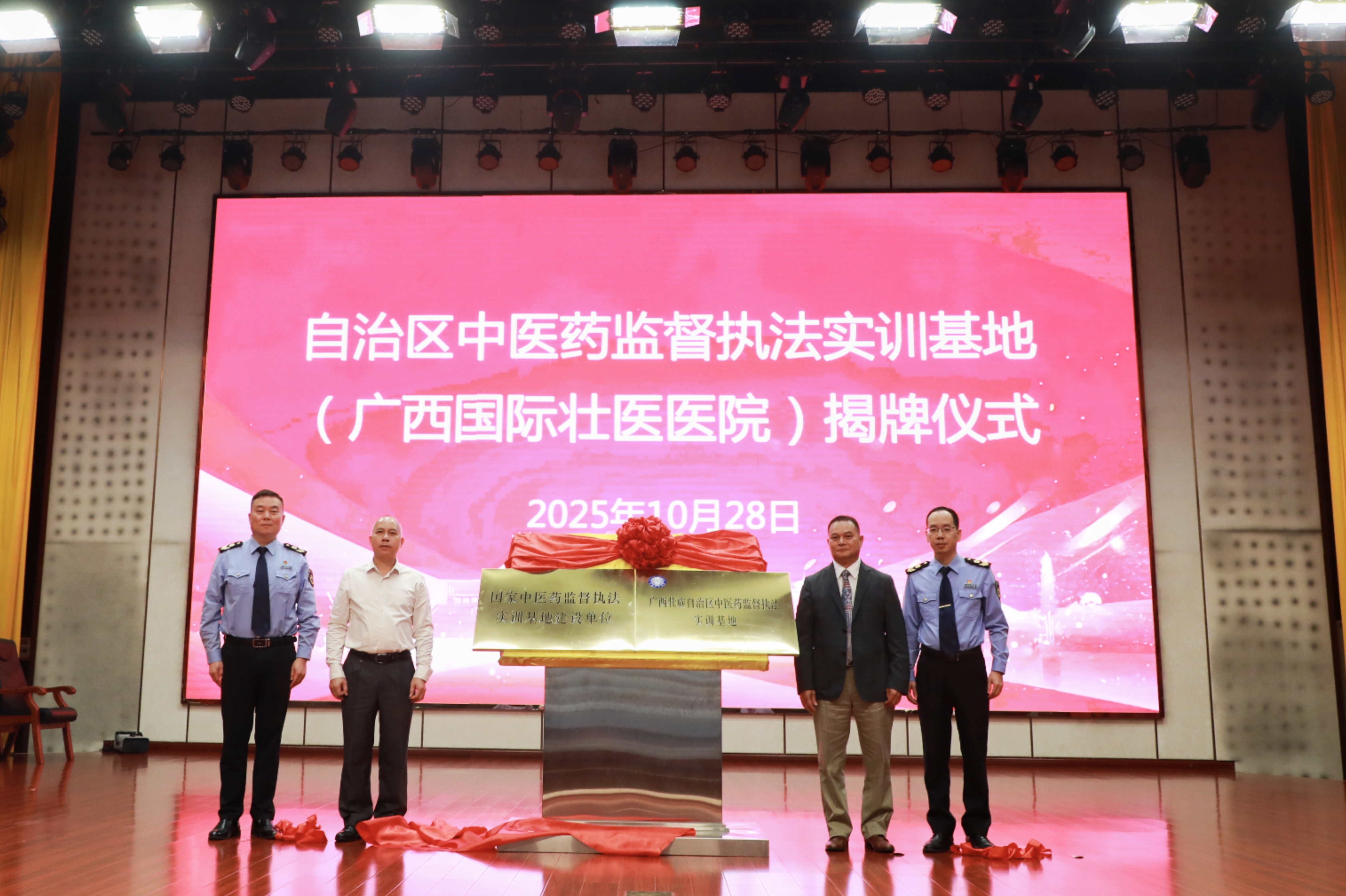 10月28日上午,“国家中医药监督执法实训基地建设单位”“广西壮族自治区中医药监督执法实训基地”在广西国际壮医医院揭牌。自治区卫生健康委党组成员,自治区中医药局党组书记、局长黎甲文,广西国际壮医医院党委副书记、院长黄国东,自治区卫生监督所党委书记、所长景军,河池市疾控中心(卫生监督所)主任(所长)韦家维出席仪式并为实训基地揭牌。