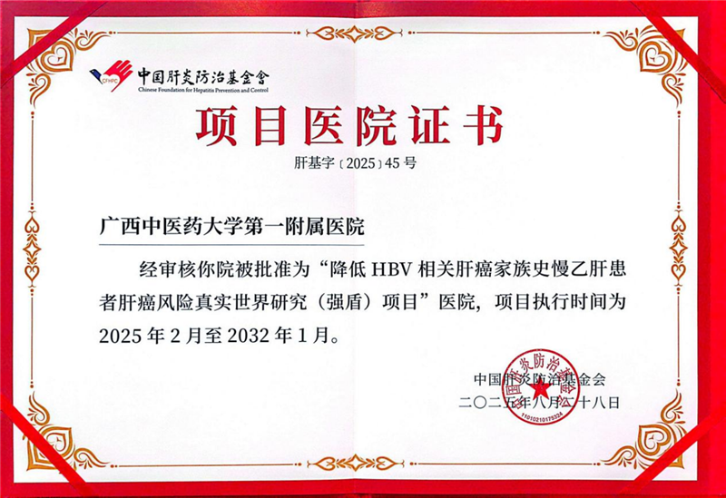 近日,第一附属医院正式获批成为“降低HBV相关肝癌家族史慢乙肝患者肝癌风险真实世界研究(强盾)项目”合作医院,这标志着第一附属医院在肝病中西医结合防治领域的临床与科研实力获全国肝病学界高度认可。