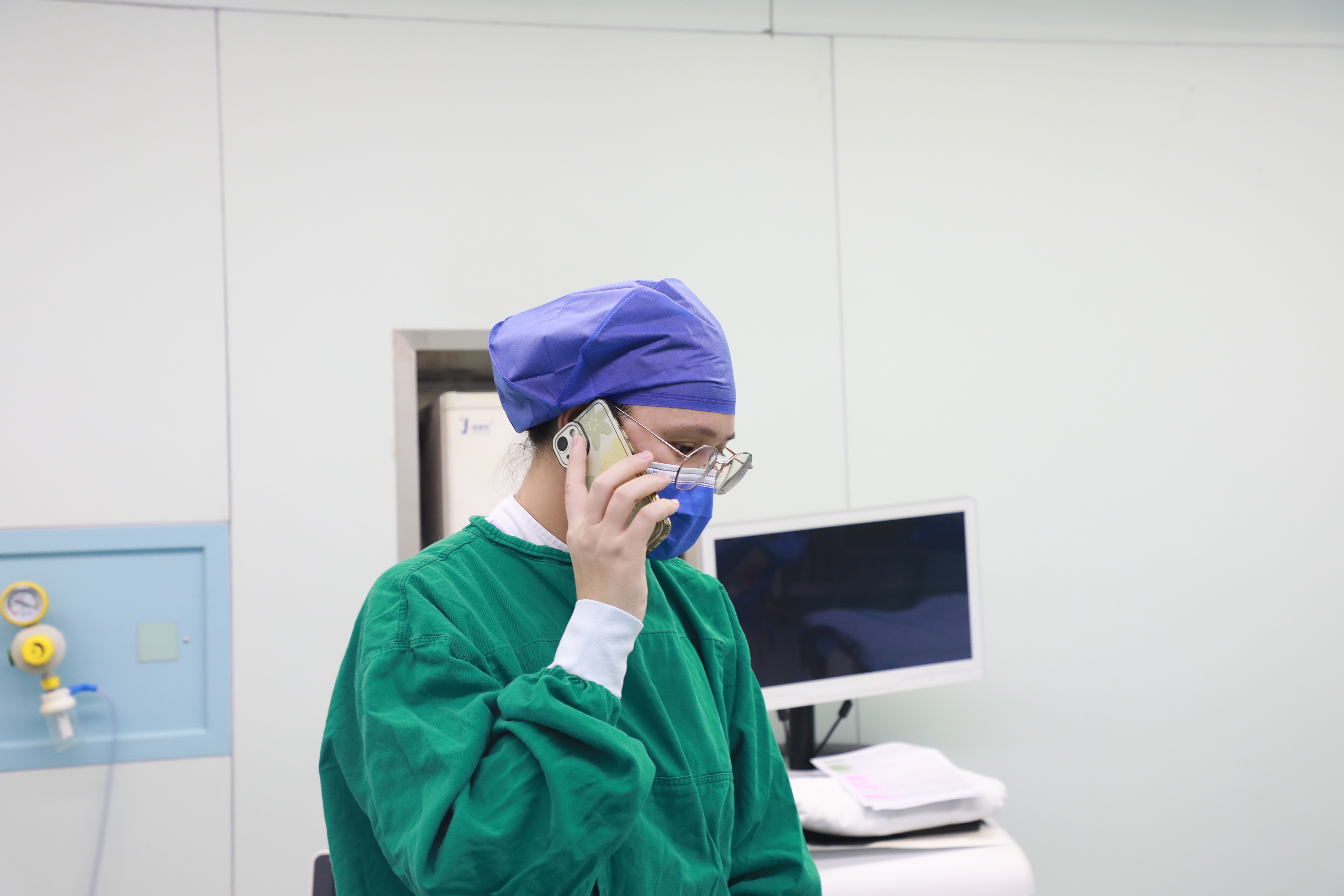 ▲护士采血好后,电话通知输血科和介入科