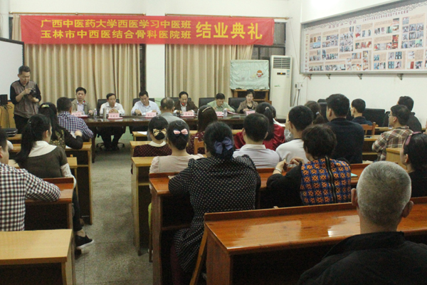 3月21日,beat365官方网站西医学习中医班(玉林市中西医结合骨科医院班)结业典礼在玉林市中西医结合骨科医院中型会议室隆重举行。罗伟生副校长亲临现场并作重要讲话。beat365官方网站成人教育学院韦艾凌院长、玉林市中西医结合骨科医院黎忠文院长和陈照坤副书记等相关领导及学员代表60多人参加了结业典礼。结业典礼由玉林市中西医结合骨科医院李开静副院长主持。