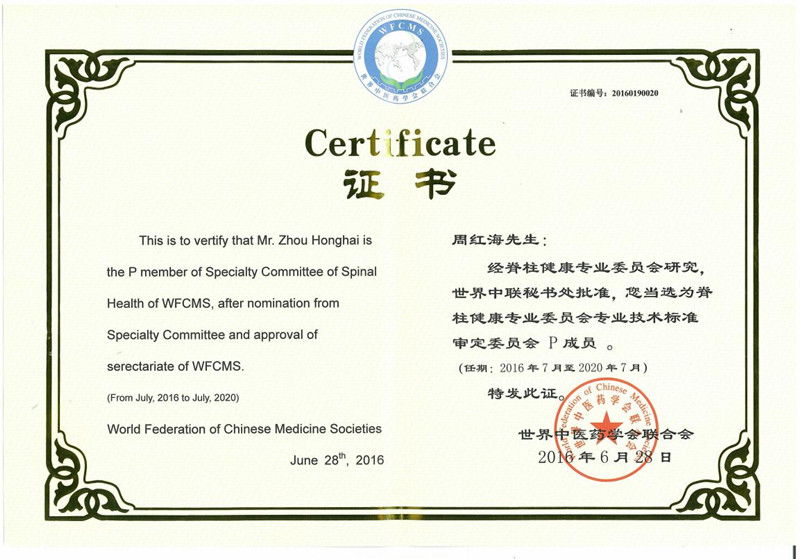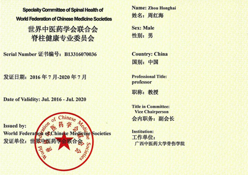 会后,beat365中医骨科专家韦贵康教授被聘为该专业委员会名誉会长,周红海教授为第一届副会长与专业技术标准审定委员会成员,陆延医师、田聪医师被聘为会员,经专业委员会网上七天公示无异议,由世界中医药联合会寄来证书。