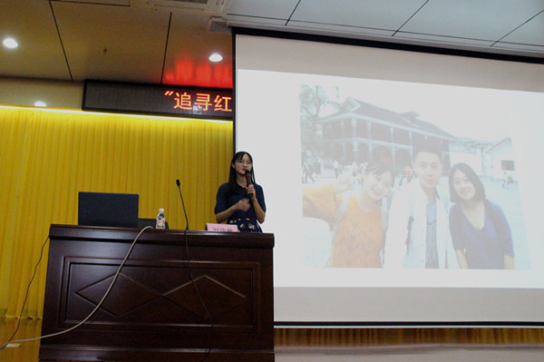 会上,刘欣然和大家分享参与此次“重走长征路”活动的心路历程并向大家展示了照片。她说,现在人们认为当下拥有幸福是理所应当的,却不知道它的来之不易。当刘欣然经历吃生米、爬雪山等一系列还原长征生活的体验后,她更深刻地认识长征对于当代人的重要性。