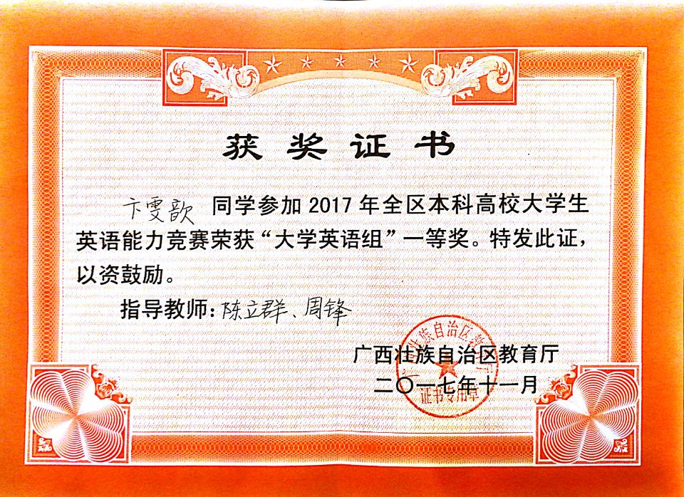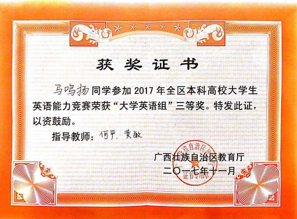 喜报:beat365学生获得2017广西本科高校大学生英语能力竞赛一等奖