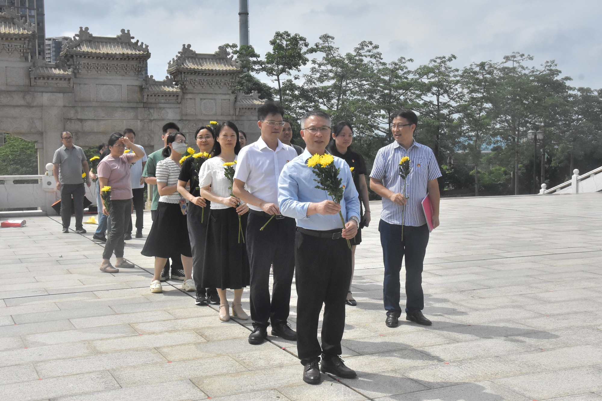 当日15时,陵园内松柏凝翠,庄严肃穆。全体人员列队整齐,党员佩戴党员徽章,以肃穆姿态致敬先烈。党总支书记唐耀平带领党员代表向烈士纪念碑敬献菊花,并在发言中强调:“要以英烈精神为指引,将初心使命融入教书育人与中医药事业发展实践。”随后,全体人员行三鞠躬礼,寄托深切哀思。