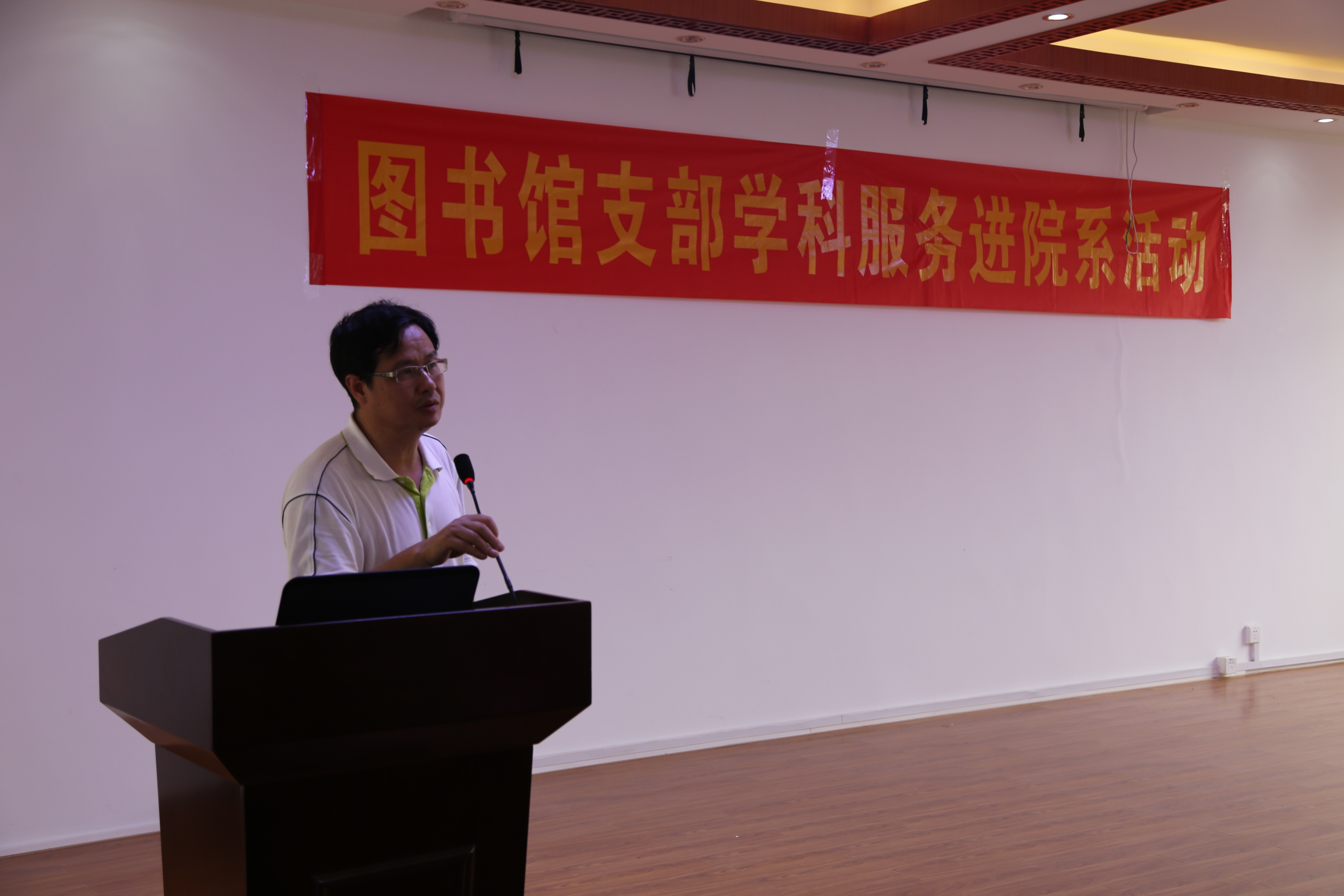 龚名师书记作欢迎辞。蒋才武馆长介绍了图书馆资源建设及前期开展了“八桂书香”、“书海寻宝”和数据库培训等一系列的服务活动,但参与教师人次不多。因此,图书馆转变服务理念,走出图书馆,到各学院和教研室中开展嵌入式的学科服务。