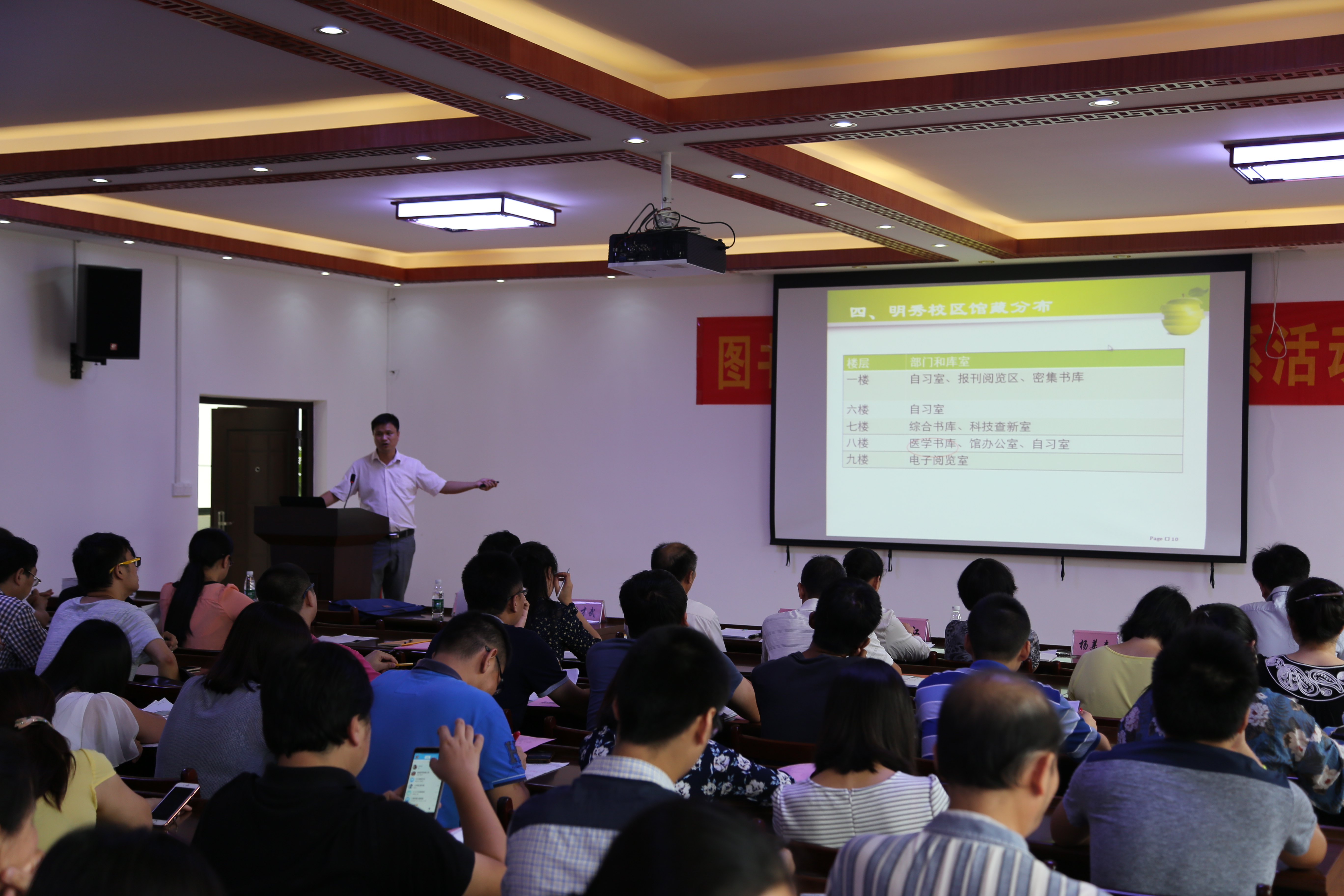 7月5日下午,图书馆党支部以“两学一做”为主题到基础医学院开展第二期“学科服务进院系”服务活动,图书馆馆长蒋才武、副馆长傅鹏,基础医学院党委书记龚名师、院长林江、副院长杨美春、副书记龙春莉、副院长肖健,以及基础医学院的师生和图书馆支部的全体党员近70人参加了本次图书馆资源和服务推介会。