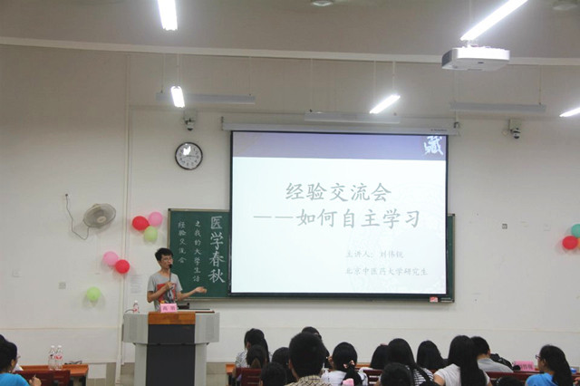值第五届全国中医青年论坛在本校举办之际,5月9日晚上,基础医学院在仙葫校区教学楼2栋303教室成功举办了“医学春秋”系列活动之“我的大学生活——我是如何自主学习” 经验交流会。基础医学院荣幸邀请到本届论坛优秀青年教师、北京中医药大学硕士研究生导师高鹏老师和本届论坛优秀青年学生、北京中医药大学研究生刘伟悦担任本次交流会的主讲嘉宾。