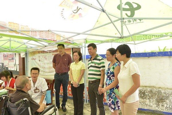 第一临床医学院党委书记李敏智、副院长桂雄斌、周建国和前来就诊的群众进行亲切交流