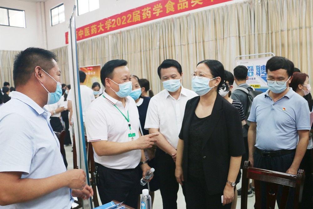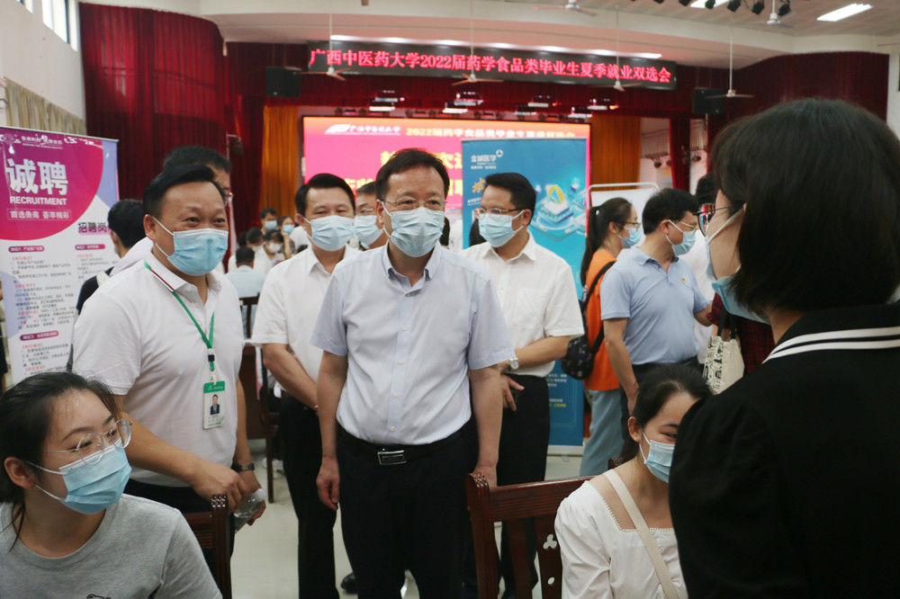 6月17日线下双选会上,学校党委书记莫锦荣、校长姚春、副书记庞宇舟、纪委书记覃宇环、总会计师何刚亮等领导亲临会场指导,了解用人单位招聘情况,与用人单位和毕业生亲切交流;学校教务处、学工处、药学院等职能部门的领导到会场向用人单位了解beat365毕业生人才培养质量等情况;参会的用人单位与毕业生进行愉快地洽谈,场面十分热烈。